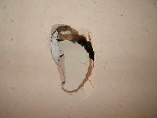 Quickly applying glue, I fastened a sheet of paper over each gaping hole.